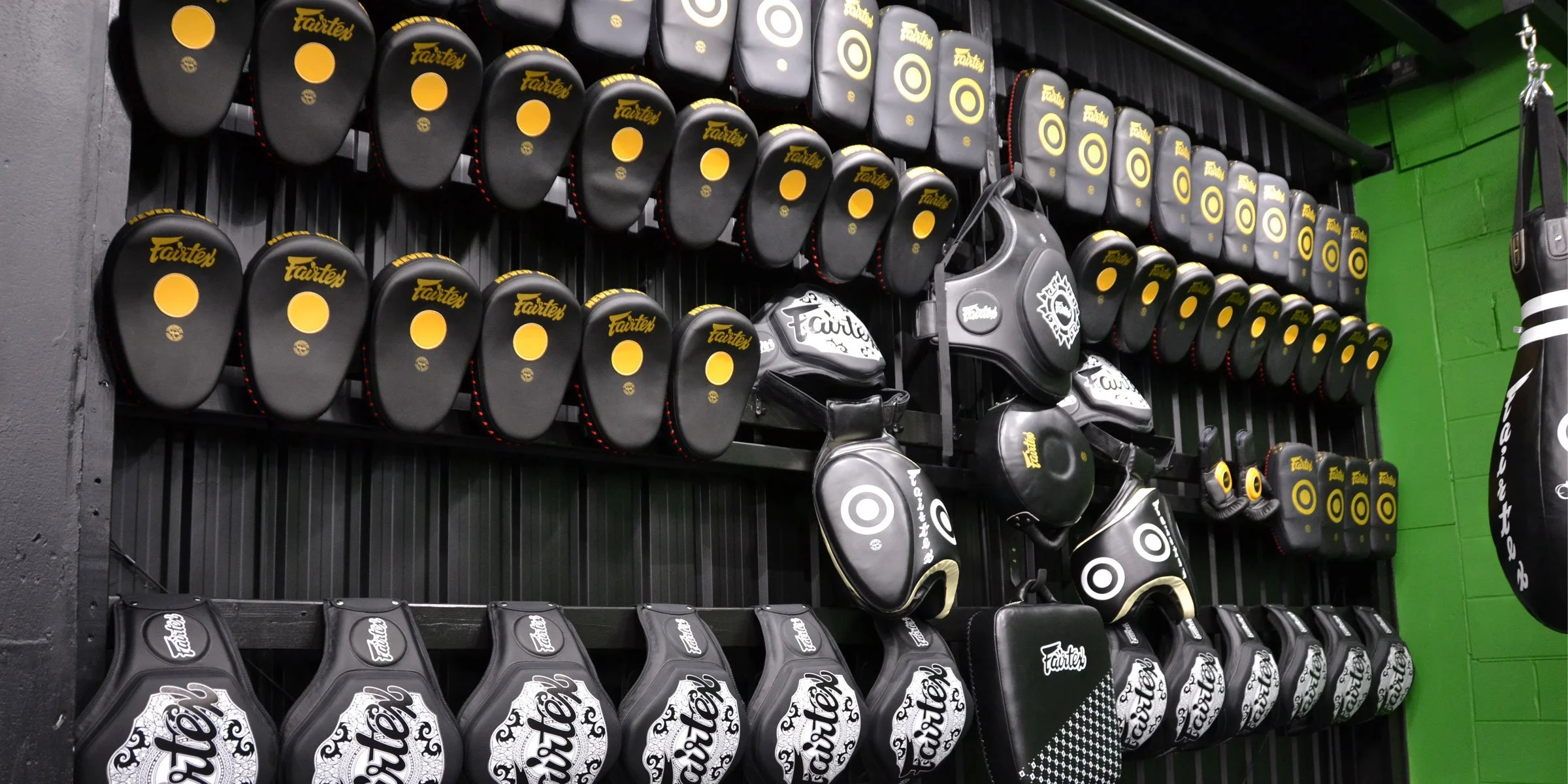 to give our members the best training experience, we’ve chosen only the finest quality equipment from Fairtex with a full range of light-weight Thai kick pads, the classic large focus mitts, double-padded lightweight belly pads, the iconic “suitcase” low kick pad, a donut pad for heavy punches, a set of thigh pads for low kick combos, a deluxe trainers vest and a set of the hybrid coach-sparring gloves all combined to give our members all the options for every aspect of muaythai training.